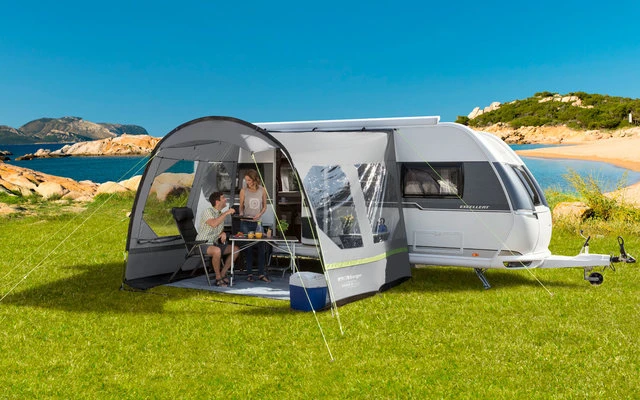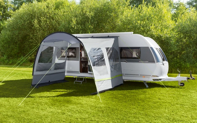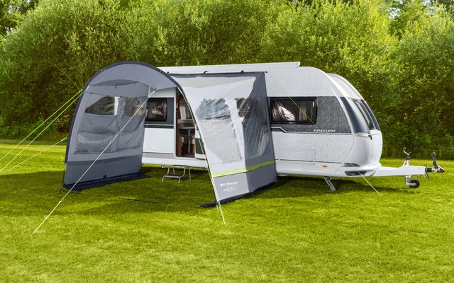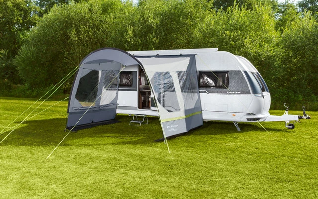 Geräumiges Sonnenvordach mit großen Fenstern (von innen blickdicht verschließbar).
